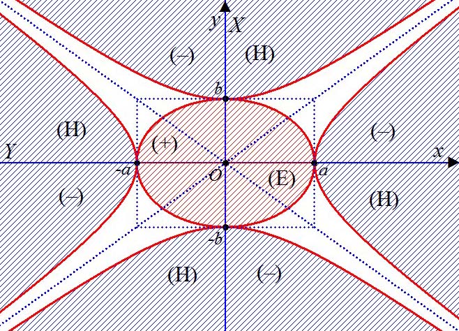 Phần dương (+) trong mô hình trên, ký hiệu bởi (E), được giới hạn bởi đường Ellipse; phần âm (–), ký hiệu bởi (H), được giới hạn bởi các đường Hyperbole liên hợp với Ellipse. Cụ thể, mô hình E-H được xác định bởi các miền giới hạn bởi các đường cong có phương trình[3]: