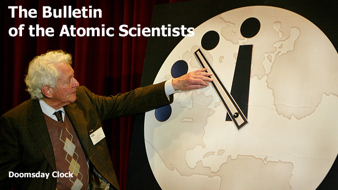 Bắt đầu từ 1947, khi cuộc chạy đua vũ trang hạt nhân bắt đầu, tạp chí The Bulletin of the Atomic Scientists bắt đầu đưa hình ảnh chiếc Đồng hồ Tận thế (Doomsday Clock) lên trang bìa của nó, để báo động cho toàn nhân loại biết chúng ta đang ở gần ngày tận thế chừng nào. Thời điểm “midnight” (giữa đêm) tượng trưng cho ngày tận thế. Từ 1947 đến 2000, kim đồng hồ đã dịch chuyển 15 lần về phía “midnight”. Năm 2000, kim đồng hồ thông báo còn 9 phút nữa sẽ đến “midnight”. Năm 2010 còn 6 phút. Năm 2012 còn 5 phút…