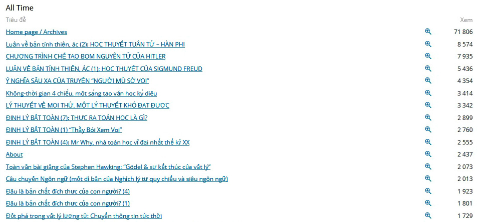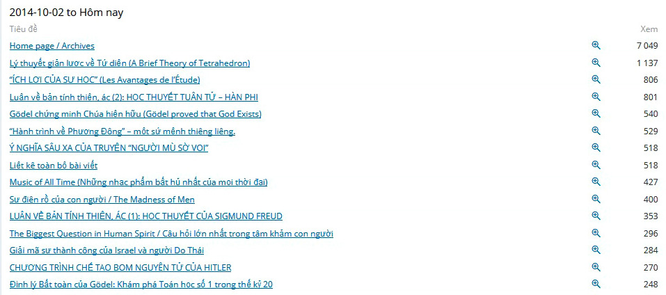 Chủ đề được độc giả quan tâm nhiều nhất vẫn là những vấn đề thuộc về con người, về Thiện/Ác, về Đạo, về bản chất của nhận thức, giới hạn của nhận thức, … Bằng chứng là những bài viết như “Luận về bản tính Thiện/Ác”, “Chương trình chế tạo bom nguyên tử của Hitler”, “Định lý Bất toàn”,… luôn luôn nằm trong “top ten” của các bài viết “ăn khách” nhất, nhận được nhiều bình luận nhất, được đăng lại trên nhiều trang mạng khác, kể cả các trang của các tổ chức chính thức, của các hội khoa học, hoặc của cá nhân,… bất kể những bài đó đã được viết ra từ nhiều năm trước đây. Thực tế này thật dễ hiểu, bởi đó là những chủ đề gắn liền với hạnh phúc của từng người và của toàn nhân loại, liên quan tới số phận của mỗi chúng ta và con cháu chúng ta. Vả lại, còn gì đáng quan tâm hơn và thú vị hơn việc tìm hiểu chính mình, xem mình là gì, là ai, để mưu cầu hạnh phúc cho mình và cho cộng đồng? Sau đây là thống kê của WordPress.com về những bài có nhiều độc giả nhất kể từ khi trang PVHg’s Home được thành lập:
