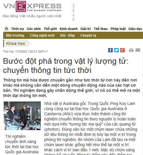 “Tương tác ma quái” (ghost interaction) là một thuật ngữ do chính Albert Einstein thốt lên khi chứng kiến một hiện tượng kỳ quái không thể giải thích được: một hạt photon có thể cùng một lúc tồn tại ở hai vị trí hoàn toàn cách biệt trong không gian. Nói cách khác, hai hạt photon ở hai vị trí hoàn toàn cách biệt có thể có mối liên hệ “tương tác ma quái” với nhau sao cho chúng ứng xử giống hệt nhau – giống đến mức chúng có thể xem như một hạt duy nhất cùng một lúc tồn tại ở hai nơi khác nhau. Điều đó có nghĩa là hạt này ứng xử thế nào thì hạt kia cũng ứng xử thế ấy – hạt này mang thông tin thế nào thì hạt kia cũng mang thông tin thế ấy. Giả sử ta có hai hạt như thế, một ở Hanoi, một ở Sydney. Ta điều khiển sao cho hạt ở Hanoi mang một thông tin nào đó thì lập tức hạt ở Sydney cũng mang thông tin ấy, tức là thông tin đã được truyền từ Hanoi tới Sydney một cách tức thời mà không cần có một dòng chuyển động nào của các hạt lượng tử. Công nghệ cáp quang hiện nay đã là một thành tựu thần kỳ, tốc độ cáp quang sẽ ngày càng lớn để thỏa mãn nhu cầu của con người, nhưng dù lớn đến mấy cũng vẫn chỉ là một trò chơi khiêm tốn so với tốc độ tức thời của công nghệ “teleportation” (viễn tải lượng tử) trong tương lai, trong đó hạt lượng tử có thể xem như một “Tề Thiên Đại Thánh” cùng một lúc vừa có mặt ở hạ giới vừa có mặt trên thiên đình – một phép lạ của thế giới lượng tử! Phép lạ ấy đã bước đầu trở thành sự thật, như đã được giới thiệu trong bài “Bước đột phá trong vật lý lượng tử: chuyển thông tin tức thời” của Phạm Việt Hưng trên VnExpress ngày 01/07/2002 [địa chỉ: http://vnexpress.net/tin-tuc/khoa-hoc/buoc-dot-pha-trong-vat-ly-luong-tu-chuyen-thong-tin-tuc-thoi-2057788.html ]