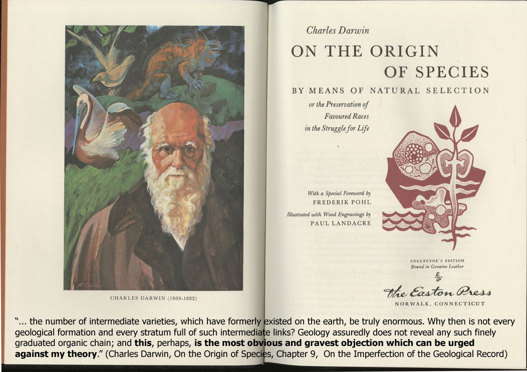 Toàn bộ thuyết tiến hóa, kể từ cuốn “Về nguồn gốc các loài” (1859) và cuốn “Nguồn gốc loài người” (1871) của Darwin đến những lý thuyết hiện đại sau này, đều là những giả thuyết tưởng tượng, những phỏng đoán không chắc chắn. Phỏng đoán “vĩ đại” nhất của Darwin là sự tồn tại của những thế hệ quá độ chuyển tiếp giữa các loài – vì sự tiến hóa diễn ra liên tục và dần dần tứng tí một (continuously and gradually) nên nếu loài A tiến hóa để biến thành loài B thì ắt phải có những loài trung gian nằm giữa A và B, được gọi là những thế hệ hay những mắt xích quá độ chuyển tiếp trong chuỗi tiến hóa từ A đến B. Những thế hệ này đã tuyệt chủng, nhưng theo Darwin, hóa thạch của chúng ắt phải nằm dưới lòng đất với số lượng lớn, và trước sau khoa học sẽ tìm thấy và phải tìm thấy. Nhưng phỏng đoán ấy càng “vĩ đại” bao nhiêu thì Darwin càng lo lắng bấy nhiêu về việc liệu có tìm thấy lượng hóa thạch đó hay không. Nếu không, lý thuyết của ông sẽ lâm nguy. Vâng, chính Darwin đã bầy tỏ nỗi lo lắng này trong cuốn “Về nguồn gốc các loài” (Chương 9) như sau: