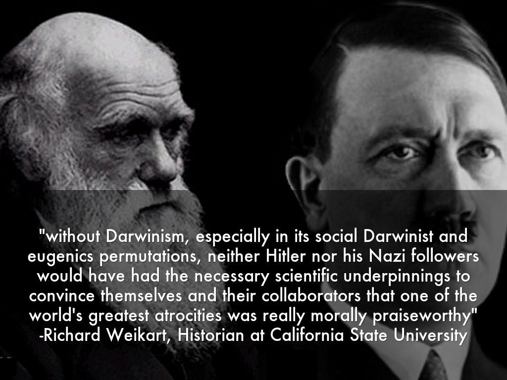 ckF8NcOY4n_1400623235165Hình bên: “Không có Học thuyết Darwin, đặc biệt các lý thuyết con của nó như thuyết ưu sinh và Darwin xã hội, cả Hiler lẫn những phần từ quốc xã đi theo hắn đều sẽ không có một chỗ dựa khoa học cần thiết để tự thuyết phục mình và thuyết phục những kẻ hợp tác với chúng rằng một trong những sự độc ác kinh khủng nhất lại thực sự đáng được ca ngợi về mặt đạo đức” (Richard Weikart, nhà lịch sử tại Đại học Tiểu bang California).