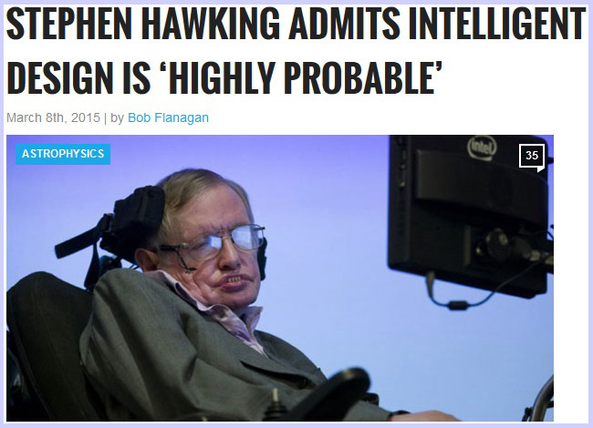 Hình ảnh bên là một phần của bài báo “STEPHEN HAWKING ADMITS INTELLIGENT DESIGN IS ‘HIGHLY PROBABLE’” (Stephen Hawking thừa nhận rất có thể có thiết kế thông minh) của Bob Flanagan, ngày 08/03/2015 trên trang mạng World News Daily Report: