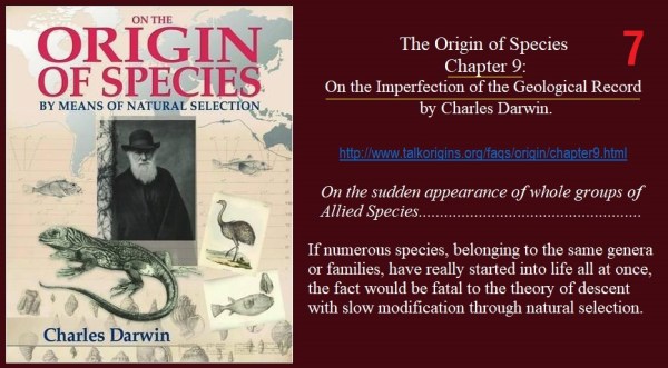 7. Nếu một số lớn các loài, thuộc cùng một giống hoặc một họ, tất cả đã thực sự xuất hiện cùng một lúc, thì sự thật đó là một tai họa đối với lý thuyết về nguồn gốc các loài với sự biến đổi dần dần thông qua chọn lọc tự nhiên.