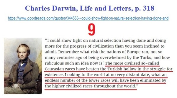 9. Các chủng tộc văn minh hơn được gọi là người Caucase đã đánh bại các tộc người trong lòng chảo Thổ Nghĩ Kỳ trong cuộc đấu tranh sinh tồn. Nhìn thế giới vào một ngày không xa lắm, một số lượng lớn các chủng tộc thấp kém hơn sẽ bị xóa sổ bởi các chủng tộc văn minh hơn trên khắp thế giới.