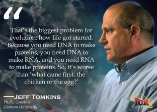 Vấn nạn lớn nhất đối với thuyết tiến hóa là làm thế nào để sự sống bắt đầu. Bởi vì bạn cần DNA để tạo ra proteins, bạn cần DNA để tạo ra RNA, và bạn cần RNA để tạo ra proteins. Vì thế thật là khó xử, vì cái gì có trước? Đó là nghịch lý con gà và quả trứng / That’s the biggest problem for evolution: how life got started. Because you need DNA to make proteins, you need DNA to make RNA, and you need RNA to make proteins. So, it’s worse than what came first, the chicken or the egg?[33]