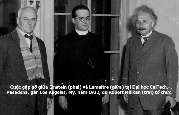 Abbé Georges Lemaître (1894-1966) gặp Albert Einstein lần đầu tiên vào Tháng 10 năm 1927, trong quá trình diễn ra Hội nghị Solvay lần thứ năm về vật lý ở Brussels. Những hội nghị này, như chúng ta đã biết, đóng vai trò chủ yếu trong lịch sử vật lý. Hội nghị năm 1927 chứng kiến sự có mặt của Marie Curie, Bohr, Born, Dirac, de Broglie, Schrödinger, Heisenberg,… Người gợi ý với ban tổ chức hội nghị nên mời Lemaître tới dự hội nghị này có lẽ là Théophile de Donder, Giáo sư Đại học Tự do ở Bruxelles (Université Libre de Bruxelles”), ông là người đã viết một trong những cuốn sách đầu tiên bằng tiếng Pháp về Thuyết Tương đối Tổng quát của Einstein. De Donder biết rõ chàng trai Lemaître, vì ông nằm trong ban giám khảo trao cho anh một học bổng du học tại Đại học Cambridge ở Anh, sau khi Lemaître đoạt giải trong một kỳ thi mang tên “The Physics of Einstein” (Vật lý của Einstein). De Donder nói, bằng cách đó ông đã giới thiệu Lemaître với Arthur Eddington rằng “ông thấy Lemaître là một sinh viên thông minh, có một viễn kiến cực kỳ nhanh nhạy và sáng suốt, và một khả năng toán học lớn”.
