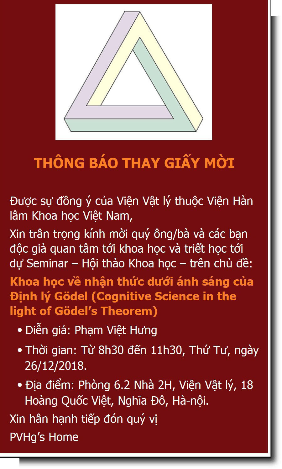 18/12/2018 Seminar of Gödel’s Theorem / Hội thảo về Định lý Gödel Chia sẻ:Chia sẻ Bấm để gửi một liên kết tới bạn bè (Mở trong cửa sổ mới) Email Bấm để in ra (Mở trong cửa sổ mới) In Nhấn vào chia sẻ trên Facebook (Mở trong cửa sổ mới) Facebook Nhấp để chia sẻ trên X (Mở trong cửa sổ mới) X Thích Đang tải... Đã đăng trong Giáo Dục Bình luận về bài viết này