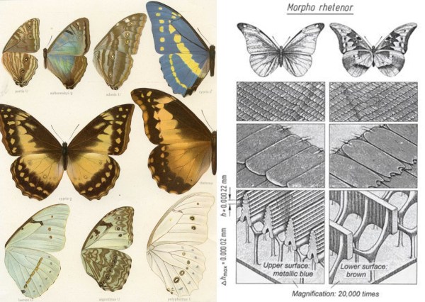 Dưới những kính hiển vi có độ phóng đại 20000 lần, người ta biết rằng bí mật mầu sắc lạ thường của bướm Morpho Rhetenor nằm trong một cấu trúc phi thường: một mạng lưới kẻ ô vuông sao cho ánh sáng khi tác động vào những đường kẻ ô thì có mầu bị triệt tiêu, có mầu lại nổi lên, tạo thành một mầu sắc huyền ảo. Hiện tượng này giống như hai sóng nước giao thoa: tại điểm này hai sóng triệt tiêu nhau, tại điểm bên cạnh hai sóng lại cộng hưởng thành một điểm nhô lên…