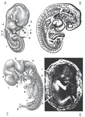 Trong giai đoạn phôi, các lá phổi, mắt, và tai đã hình thành, mặc dù chúng chưa được sử dụng. Sau hai tháng, phôi chỉ dài khoảng từ 3 đến 4cm. Nhưng mặc dù còn quá nhỏ như thế mà nó đã có tất cả các cơ quan. Trong những tháng tiếp theo, các cơ quan này lớn lên về kích thước và định hình hình thù cuối cùng của nó.