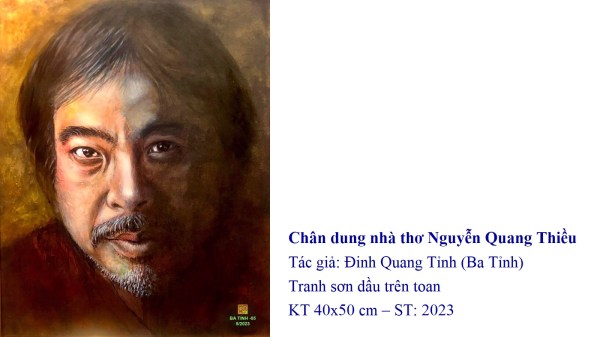 Bức tranh chân dung Nguyễn Quang Thiều RẤT ĐẸP, rất cá tính – vừa thể hiện chính xác Nguyễn Quang Thiều, vừa thể hiện phong cách hội họa rất đặc trưng của Ba Tỉnh (mà có người khẳng định với tôi rằng ông là họa sĩ chân dung số 1 VN hiện nay). Tôi chưa gặp anh Nguyễn Quang Thiều, nhưng trông thấy ảnh anh ấy trên mạng nhiều lần nên tôi cũng nhận ra chân dung anh ấy ngay tức khắc, trước khi đọc lời giới thiệu của anh. Chi tiết nổi bật trong chân dung này là đôi mắt và bộ râu, rất ấn tượng! Đôi mắt rất sắc, như biết hết mọi thứ trên đời! Về ánh sáng, nửa tối nửa sáng, tôi chưa hiểu ý họa sĩ, nhưng tôi cảm thấy có ý tứ gì đó. Xin chúc mừng HS Ba Tỉnh vì một bức tranh mới rất thành công và rất xuất sắc này, và cũng xin chúc mừng anh Nguyễn Quang Thiều vì một tài sản rất quý giá. (PVH).