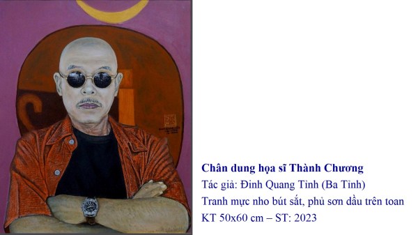 Họa sĩ Thành Chương là người nổi tiếng, ai cũng biết. Thậm chí ai cũng biết tính cách “tay chơi thượng thừa” của ông, lộ ra qua tranh vẽ rất riêng của ông, và qua cả “biệt phủ” cũng có một không hai của ông ở Sóc Sơn. Không ngờ hình ảnh của một Thành Chương như thế đã được thu gọn vào … không phải ống kính, mà được thu gọn vào trong tranh chân dung cũng rất riêng của Đinh Quang Tỉnh, như sau đây: