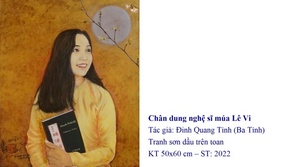 Khác với chân dung cánh mày râu, chân dung nghệ sĩ Lê Vi có vẻ đẹp dịu dàng, nhẹ nhàng. Tôi thích nhất gam màu của bức tranh này, toàn bộ trên tông vàng, nhìn qua ảnh chụp có cảm giác như tranh sơn mài. Tông vàng ấy là màu của pháp luân công, một môn tu tập cả thân xác lẫn tâm đạo, mà Lê Vi đang theo đuổi với cái tâm Chân – Thiện – Nhẫn. Nhìn nhân vật trong tranh, tay ôm cuốn Pháp Luân Đại Pháp, mắt ngước lên tầng cao, miệng nở nụ cười tươi tắn, tôi thấy nhân vật trong tranh có một tâm hồn thật trong sáng. Đó là tâm Đạo, chắc Lê Vi muốn họa sĩ thể hiện được tâm nguyện của cô, và tôi nghĩ họa sĩ đã thể hiện chính xác tâm nguyện đó.