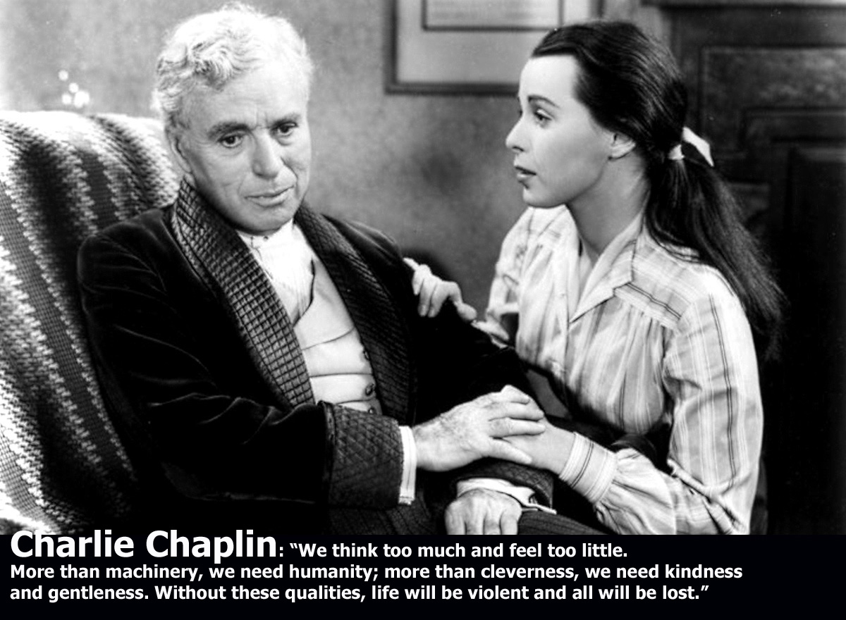 Đối với tôi, một trong những cuốn phim bất hủ nhất của mọi thời đại là Limelight (Ánh đèn sân khấu) của Charlie Chaplin. Trong phim ấy, ông già nghệ sĩ Calvero bị rơi vào tình trạng suy sụp khi khán giả chán ngấy những trò diễn của ông, lục tục bỏ rạp ra về. Nhìn ông đau khổ mà tôi ứa nước mắt. Nhưng thật may mắn, cuối cùng ông không sụp đổ. Ấy là nhờ cô Terry – cô vũ nữ mà chính ông đã cứu vớt và nâng đỡ trước đây khi cô định tự tử. Bây giờ đến lượt cô an ủi và động viên ông, khẳng định với ông rằng cuộc sống có ý nghĩa, và chính ông đã làm nên ý nghĩa đó bởi tình yêu thương…